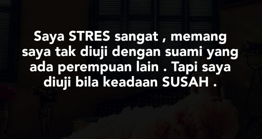 Yang buat saya tertekan sekarang dalam keadaan saya mengandung tak berapa nak larat sangat ni saya nak kena pikir macam mana nak selesaikan semua masalah saya . Saya tau suami selalu nangis setiap malam tengok saya dalam keadaan macam ni , dia tau kepala saya kusut . Tapi dia tak boleh buat apa apa sebab keadaan dia yang tak mengizinkan untuk buat kerja . Sewa rumah dah tak bayar 3 bulan ,owner rumah setiap hari msg minta . yuran sekolah anak dah tertunggak , bil api air mmg saya belum bayar sebab untuk makan pun kami kadang sehari sekali je makan . Belum lagi mak saya dekat kampung cakap nak pakai duit untuk belanja barang dapo , yela mak dah tua , saya pulak anak sulung adik adik masih sekolah .