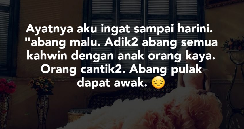 “abang malu. Adik2 abang semua kahwin dengan anak orang kaya. Orang cantik2. Abang pulak dapat awak. Sekarang bukan main gemuk lagi. Kerja awak makan tidur duduk kat rumah ni. Terus aku terdiam. Benar yang aku duga selama ini. Dia mula menyesali perkahwinan antara aku dengan dia.