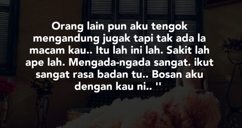 salam admin. Min. Aku sedih la min. Kandungan aku sekarang dah masuk 7 bulan. Badan2 pun dah mula sengal dan sakit2. Nak jalan, nak duduk lama, nak berdiri lama,nak baring pun serba serbi tak selesa dan tak lah seaktif masa tak mengandung.. Mengadu kat cik suami.. Mintak tolong picit2 kan kaki atau gosok-gosokkan blkg bdn biar aku rasa lega sikit lah.. Tapi suami aku cakap macam ni..’ ahh kau, orang lain pun aku tengok mengandung jugak tapi tak ada la macam kau.. Itu lah ini lah. Sakit lah ape lah. Mengada-ngada sangat. ikut sangat rasa badan tu.. Bosan aku dengan kau ni.. ”