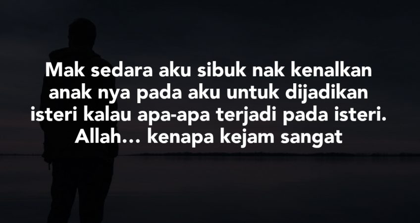 Isteri aku sekarang tengah menjalani kimoterapi. Baru lepas 2 cycle. Waktu hari raya, kami ada balik rumah ibu, tentu-tentu isteri tak boleh buat kerja rumah sebab baru habis kimo, benda dijadikan isu, dengan tubuh isteri yang makin kurus, rambut gugur, mata cenkung. Tapi, bagi aku, isteri aku masih secantik bidadari. Kenapa orang tak pernah ambil tahu pasal kami tiba-tiba masuk campur? Mak sedara aku sibuk nak kenalkan anak nya pada aku untuk dijadikan isteri kalau apa-apa terjadi pada isteri. Allah… kenapa kejam sangat.