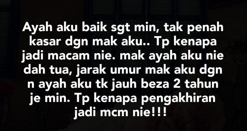 Salam min, Hmm aku tak tahu nak mulakan dari mana, Aku sedih terkilan kecewa semua bercampur baur! Keluarga aku tak penah ada masalah, mak ayah aku baik dan didik kami Adek beradek sgt baik. Tapi dugaan datang menghampap tanpa disangka min.. mak ayah aku alim orgnya, didikan agama yg dorang bagi sgt cukup dari segi solat mengaji semua dididik dengn baik. Tapi min aku sedih Sbb dah hampir 40 tahun dorang bina mahligai cinta nie hancur punah begitu saja min.