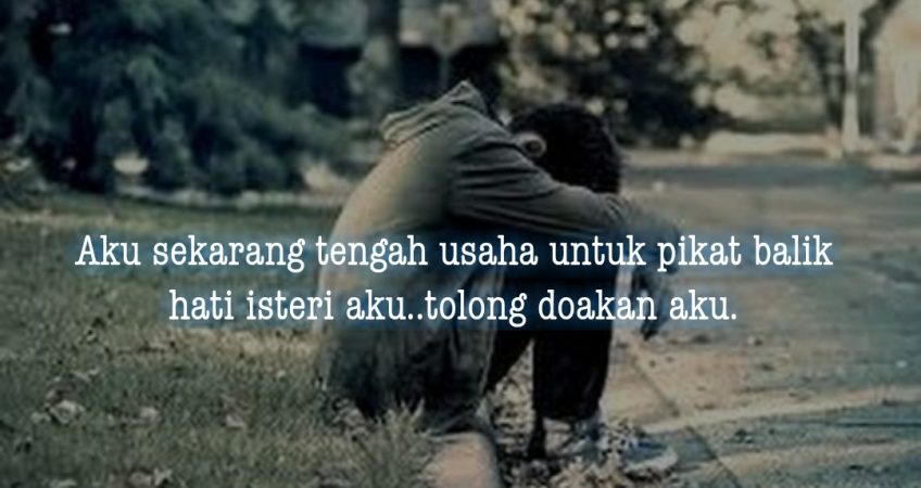 Satu hari bergaduh dengan mertua aku .. Aku terkurang ajar .. Aku marah isteri aku, Isteri aku menangis 1 hari .. Esok kan harinya dia minta aku lepaskan dia .. Dia kata aku tak hargai dia .. Dia kata aku dulu nak dapat dia manis ..dah dapat pahit .. Dia hilang rasa sayang dekat aku.. Dia tak boleh nak teruskan hidup dengan aku.. Masa tu jatuh jantung aku … Betapa terkejutnya aku.. Aku ingat dengan cinta tak kisah apa jua dugaan akan tetap bersama tapi aku silap..semua salah aku..aku minta maaf berkali2 .. Minta peluang kedua .. Bini aku hanya tersenyum tanpa berkata2 .. Aku sekarang tengah usaha untuk pikat balik hati isteri aku..tolong doakan aku..doakan hubungan kami kekal..aku tak sanggup kehilangan isteri tercinta .. Aku cinta dia sangat2.. Doakan aku kekal ye ..
