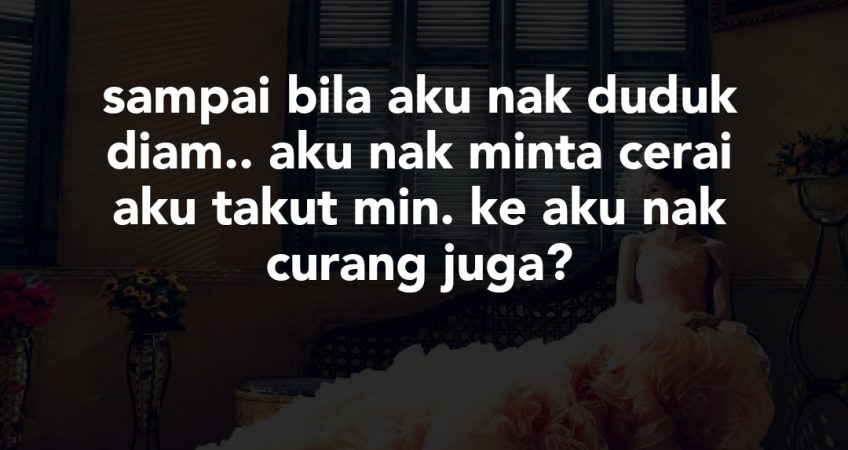 Sekarang min. suami aku dah tak macam suami yang aku mula2 kenal dulu. rumah tangga kami pun tak ceria dah. hari2 masam muka. aku stress sangat2. aku tak tau lah nak prcaya kat suami lagi atau tak sebab dah banyak kali dia tipu aku. tgok je muka dia.. aku trngat blik kat prstiwa lepas.. Allah je tahu prasaan aku min..mgkin org nmpak aku ceria n selalu trsnyun…tapi sbnrnya aku sakit sangat min..aku tak tahu nak luahkan dengan sesiapa baik kawan atau kluarga..prestasi krja aku pun menurun juga..sebab aku selalu tak hadir brtugas n sering sakit..sampai bila aku nak duduk diam.. aku nak minta cerai aku takut min..ke aku nak curang juga?