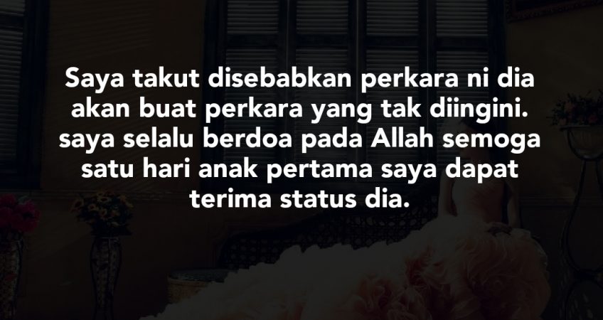 Saya takut disebabkan perkara ni dia akan buat perkara yang tak diingini. saya selalu berdoa pada Allah semoga satu hari anak pertama saya dapat terima status dia. saya tahu ni semua silap saya. saya pun tak mintak semua ni jadi. saya tahu satu hari nanti pasti dia akan tanya. apa yg patut saya katakan pada dia ? perkara ni selalu bermain di fikiran saya