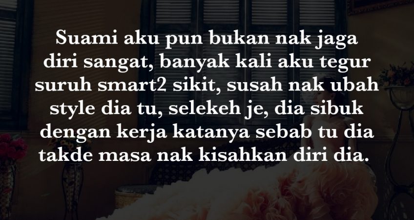 Min, hide profile aku ya. Aku dah kahwin lebih 10 tahun dan dah ada anak. Kehidupan aku dengan suami biasa2 je, aku bekerja dan semua keperluan banyak aku yang usaha sendiri. Suami sebaik2 manusia, dia dah banyak berkorban dengan aku dulu (sebelum kahwin biasalaa lelaki ni semua ok je investment kann). Nak kata tak bahagia tak juga, cuma bab duit jelaa.. Aku patut dapat lebih daripada ni, tapi dah rezeki aku setakat ni, aku redha. Suami aku pun bukan nak jaga diri sangat, banyak kali aku tegur suruh smart2 sikit, susah nak ubah style dia tu, selekeh je, penat dah aku belikan macam2, dia sibuk dengan kerja katanya sebab tu dia takde masa nak kisahkan diri dia.
