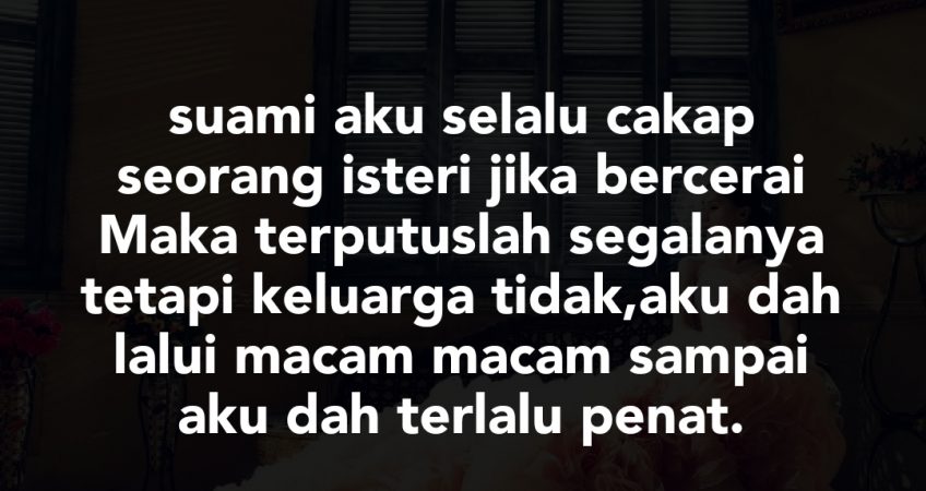 Siapa yang mintak semasa berjuang melawan kesakitan tetapi si suami tidak memperdulikan langsung diriku di hospital,dengan alasan dia terpaksa membawa ibu Dan keluarganya untuk pergi uruskan perkahwinan adiknya, ye suami ku anak mak, pro keluarganya. suami aku selalu cakap seorang isteri jika bercerai Maka terputuslah segalanya tetapi keluarga tidak,aku dah lalui macam macam sampai aku dah terlalu penat.