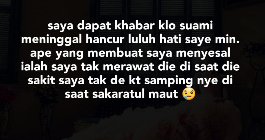 Assalamualaikum warga KRT. saya berkawin masa umur 22 tahun, umur 24 ade rezeki anak satu, umur 26 tambah lagi baby kembar jadi tiga semua boy. betuah lah saya jdi sorang ibu. menjaga tiga boy. saya memang tak pernah dok gan mertua. apa” saya dok dengan mak saya sendiri. perkawinan kami menginjak umur ke 8 tahun suami di sah kan kene kansser hati dah tak boleh buat kerje ape” keadaan ekonomi makin sulit. Terpaksa saya minta izin untuk mengadu nasib ke negri jiran. 4 bulan sudah saya kerje. saya dapat khabar klo suami meninggl hancur luluh hati saye min. ape yang membuat saya menyesal ialah saya tak merawat die di saat die sakit saya tak de kt samping nye di saat sakaratul maut