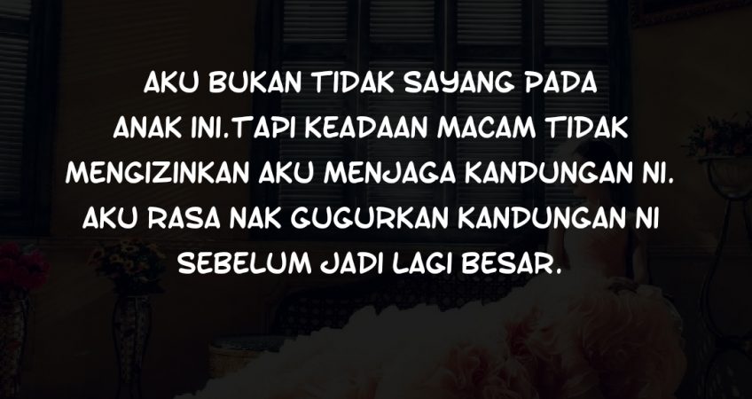 Aku tak nampak apa2 jalan penyelesaian lagi buat masa ni..yang aku tahu nak gugurkan kandungan ni sebab nak kerja nak tinggalkan semua..Anak-anak aku,aku tinggalkan dengan mak aku untuk kejar balik kerjaya aku yang pernah aku tinggalkan sebelum ni. Aku nak buktikan yang aku boleh bangkit tanpa harap dia lagi..bukan aku tak sayang pada anak ni.Tapi keadaan memang tak mengizinkan aku untuk terus menjaga kandungan ni..