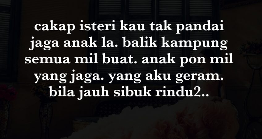 Yang ke dua. bila balik kampung suami. suami cakap kesian kat mil rindu kat anak2. so kitaorang pon bagi mil dan fil spend time dengan anak2. Tapi tak sangka mil msj suami di tempat kerja. cakap isteri kau tak pandai jaga anak la. balik kampung semua mil buat. anak pon mil yang jaga. yang aku geram. bila jauh sibuk rindu2..