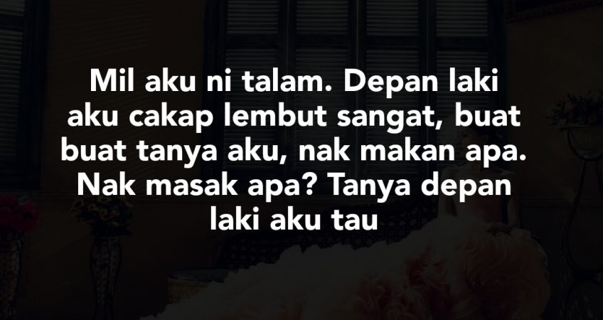 5) Mil aku ni talam. Depan laki aku cakap lembut sangat, buat buat tanya aku, nak makan apa. Nak masak apa? Tanya depan laki aku tau. Konon macam ramah dan sopan santunlah dengan aku. Sekali laki aku takde terus meroyan. “mutghai(perempuan jahat/sial)” sound like that lah. Kadang tu keluar celaka lah. Bodoh, setan. Sebabnya, aku salah ambik alas tilam dia buat alas anak aku tidur. ” Apa salahnya cakap je depan aku, eh tu tak boleh guna. Tu mak punya. Haaaa kan settle on time. Takperlu pun mengamuk sampai berjam-jam.