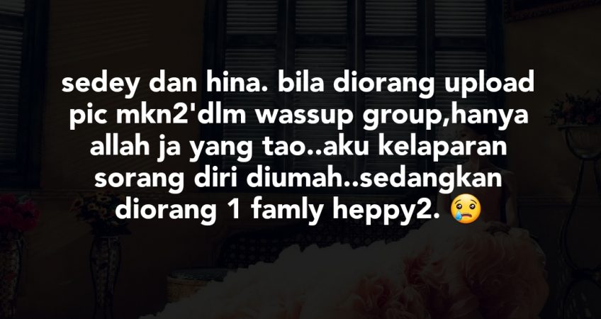 agi btambah sedey dan hina..bila diorang upload pic mkn2’dlm wassup group,hanya allah ja yang tao..aku kelaparan sorang diri diumah..sedangkan diorang 1 famly heppy2.