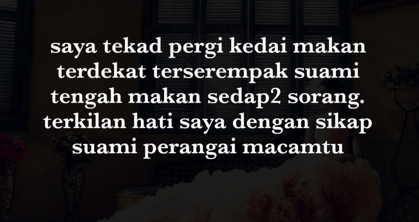 Bila sampai pekan dia tinggalkan kami katanya nak pergi tandas kejap kemudian dah rasa lapar sangat 20 minit pun suami tak muncul lagi dengan cuaca panas saya dengan anak. saya tekad pergi kedai makan terdekat terserempak suami tengah makan sedap2 sorang. terkilan hati saya dengan sikap suami perangai macamtu. Boleh dia buat kite orang macam tu dahlah saya dah lapar sangat berpanas menunggu dia boleh makan sorang2 tanpa rasa bersalah. dia tak ingat anak bini ke tengah lapar. dia buat macmni bukan sekali dua dah. ape perasaan korang kene cmtu?