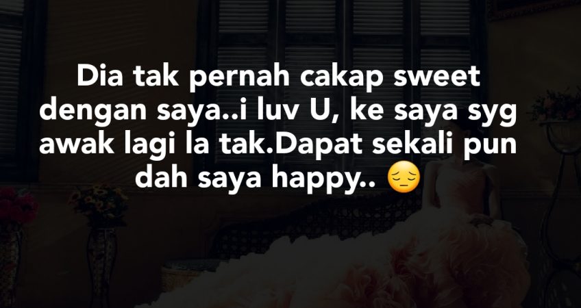 Sejak dari hari tu saya taknak dia teman say drive..dia lagi taknak..dia kata kalau saya dah expert baru dia naik sama saya…Kalau tak ada yang penting untuk keluar dia takkan keluar..Tapi saya pergi ajak beli barang dapur dia ok je. Sepanjang perkahwinan saya tak pernah rasa dia buat kejutan birthday saya,candle light dinner ke..tak pernah pun,saya cemburu tengok oranglain.Bukan suami saya tak mampu..mampu sangat dia. Saya tak tahu nak rasa apa dah sekarang..sedih,makan hati,macam2 saya dah rasa sejak brsuamikan dia..ya memang saya sayang suami saya..