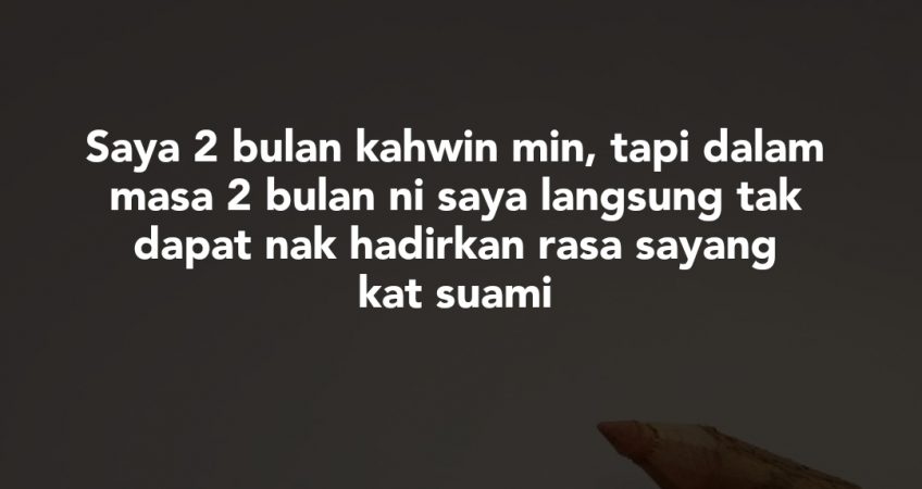 Salam admin saya. Saya nak minta pendapat atau nasihat tolong jangan membawang ya. Saya 2 bulan kahwin min, tapi dalam masa 2 bulan ni saya langsung tak dapat nak hadirkan rasa sayang kat suami Saya langsung tak ada hati, kadang2 nak bercakap pun rasa tak nak. Cerita sebelum kahwin macam nie saya dulu frust dengan bekas kekasih sebab lama2 bercinta dapat tahu dia tu laki orang. Saya ambik keputusan untuk move on dan tinggalkan dia. Dan dalam beberapa bulan saya tengah move on tu saya kenal dgan suami saya sekarang. Dan masa tu saya ibarat macam mempergunakan dia untuk saya lupakan bekas bf tu. Dan beberapa bulan saya kenal dengan suami terus saya dan dia rancang untuk ke arah pernikahan. Saya setuju masa tu tanpa fikir panjang yelah konon nak move on dan buka buku baru.
