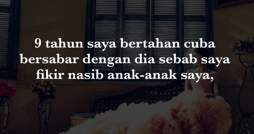Dulu dia pinang saya secara baik dengan keluarga tapi sekarang saya minta cerai pun dia tak nak, tapi kerap pukul dan hina-hina saya. Dan kerap halau saya dari rumah, dan suruh saya pulang kerumah orang tua saya. 9 tahun saya bertahan cuba bersabar dengan dia sebab saya fikir nasib anak-anak saya, tapi saya rasa sia-sia. Saya pendam semua yang berlaku kepada saya. Suami pukkul saya hina saya saya pendam sendirian tanpa pengetahuan siapa pun.