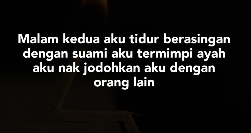 Malam kedua aku tidur berasingan dengan suami aku termimpi ayah aku nak jodohkan aku dengan orang lain. aku tak nak. Tiba2 tersedar dari mimpi aku cakap dekat diri aku sampai bila nak macam ni gaduh hari2 aku termenung jap dalam hati berdoa Ya Allah bantulah aku nak berubah, aku tak nak hidup aku huru hara bagilah aku jalan keluar dari masalah yg berpunca dari kebo dohan aku sendiri.