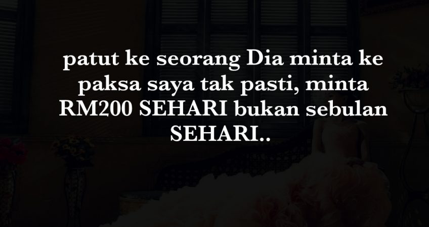 Kami akur dan redha dengan keputusan dia dan pilihan hati dia, sebab kami nak yang terbaik untuk ayah kami, tapi bagi saya sendiri jujur saya cakap saya tak menolak pun untuk terima mak baru dalam family saya, yang saya kesah pilihan dia biar sesuai dan boleh terima kami sebagai anak secara baik bukan anggap kami macam orang luar.. Sudah bermacam-macam masalah timbul lepas tu, ok.. Saya skip bab masalah tu tak nak cerita banyak pasalnya dah berlalu, yang jadi masalah pasal yang sekarang saya ada dengar yang mak baru a. K. A (mak tiri) bagi sedap sikit la ayat saya gelarkan dia mak baru eh.. Saya nak tanya pendapat korang la patut ke seorang Dia minta ke paksa saya tak pasti, minta RM200 SEHARI bukan sebulan SEHARI..