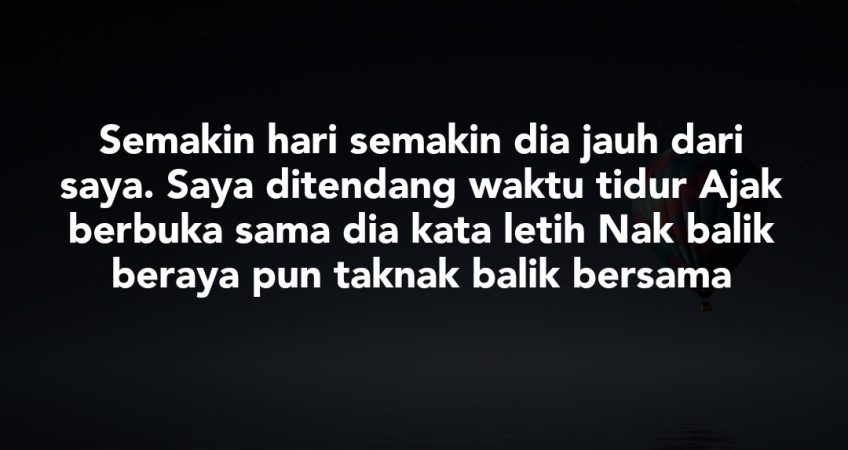 Semakin hari semakin dia jauh dari saya. Saya ditendang waktu tidur Ajak berbuka sama dia kata letih Nak balik beraya pun taknak balik bersama. silapnya kami pjj. Tapi saya selalu ajak duduk dengan saya. Sebab dia dah tiada transport. Saya pinjam motor ex5 akak saya. Dia cakap jauh dia sakit pinggang.. sampilah ke hari raya. Kami tak bersama tido berasing bila malam. Waktu siang mesra depan orang lain bukan main lagi. Saya ajak pulang beraya kg saya pd raya ke-3. Dia kata tak nak. Puas saya pujuk shingga dia bagi syarat tak boleh bersama. Tak ape lah asalkan saya bawa jumpa mak saya. Raya ke 5 kami pulang ke kl. Wife saya keje esoknye.