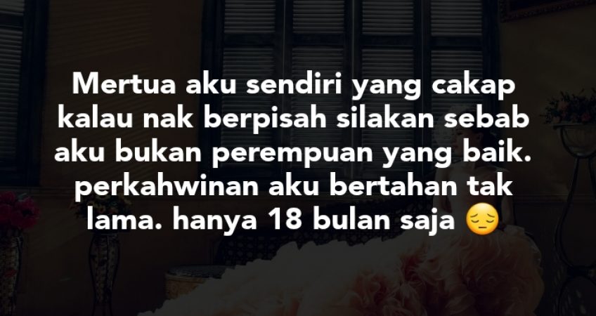 mertua aku sendiri yang cakap kalau nak berpisah silakan sebab aku bukan perempuan yang baik. sekarang aku dah bercerai dengan dia. tapi satu sen pun dia tak nak bayar dekat aku.kadang menangis kadang termenung.elak aku jadi meroyan je. kerja? aku sekarang dalam eddah. baru saja 2minggu. simpanan aku dalam bank hanya tinggal rm3. sedihkan hidup aku.nak salahkan siapa??sebab tu pilihan aku sendiri. thanks min sudi siarkan. doakan aku kuat, sebab orang kampung pandang serong pada janda.