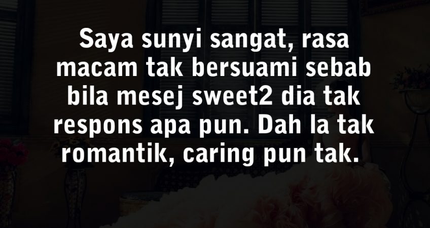 Salam admin. Mcm biasa, fake acc kan. Tak paham la suami ni nak apa sebenarnya. Saya sunyi sangat, rasa macam tak bersuami sebab bila mesej sweet2 dia tak respons apa pun. Dah la tak romantik, caring pun tak. Saya pregnant dulu, ada alahan teruk, duduk sorang kat rumah. Dia pergi kerja bukan nak tanya bini okay ke tak, tapi mesej sweet2 perempuan lain boleh pulak. Memang berasap la saya bila dpt tau. Pastu konon berubah tak mesej perempuan lain dah, tapi mesej bini taknak reply. Geram je. Padahal saya ni jaga je penampilan luar dalam, malam2 nak tido pun wangi. Bukan macam dia, bau asap rokok, tapi takde pulak saya dingin dengan dia.