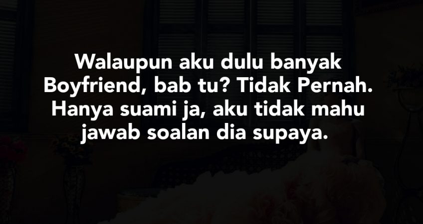 Dia tanya aku kalau pernah disentuh dicium atau pegang aku jawab tiada tapi dia suruh sumpah saya takut bab bersumpah ni, jadi saya terus terang lah, tipu lah klu saya ni tak pernah di sentuh di cium. lepas tu suami aku ckp sudah jangan terus cerita sakit hati aku dengar, tapi tu kan kisah silam sebelum kami kenal. dia senyum2 min tapi saya tahu dia cemburu, sbb dia ckp dia cemburu bilah dgr kisah silam ex aku tu dia suruh berhenti cerita, tapi tadi pagi dia, sebelum turun kerja dia ckp dgn aku kita belum selesai lagi,aku nak kau cerita semua nya dgn aku,