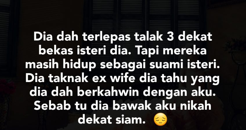 Satu hari tu, dia bawak aku balik kampung dia dekat kedah. Jumpa keluarga dia. Terus kami nikah dekat siam min. Aku tanya dia ‘kenapa kena nikah dekat siam? Kan,awak duda’. Rupa rupanya bekas isteri dan dia masih tinggal sebumbung min. Dia dah terlepas talak 3 dekat bekas isteri dia. Tapi mereka masih hidup sebagai suami isteri. Dia taknak ex wife dia tahu yang dia dah berkahwin dengan aku. Sebab tu dia bawak aku nikah dekat siam.