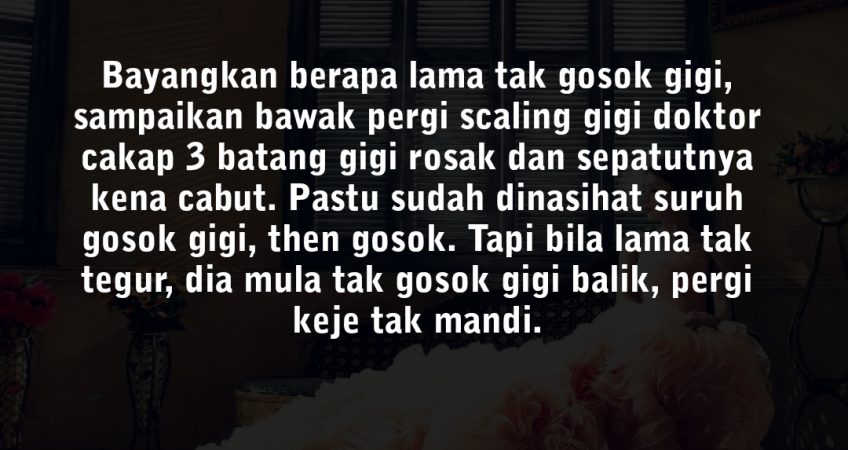 Tlg hide profile aku admin, tq Nak luah sikit ni, sudi2 lah baca ye. Maaf kalau panjang sangat. Dulu, hidup kami laki bini tenang je. Hidup berdua, ada privacy untuk kami. Lepas tu, adik dia sorang nak dtg keje sini. Aku ok je sebab dia sorang, dan pikir bole ubah dia sekali. Lagipun adik dia yang sorang ni macam ok sikit. Tapi lama2, makin rimas aku. Dengan semua benda bergantung kat abang dia, nak pergi dating dengan awek pun kena abang dia urus. Macam tak ade ape dia boleh handle sndiri. Dengan perangai pengotor dia, bayangkan berapa lama tak gosok gigi, sampaikan bawak pergi scaling gigi doktor cakap 3 batang gigi rosak dan sepatutnya kena cabut. Pastu kite orang nasihat suruh gosok gigi, then gosok. Tapi bila lama tak tegur, dia mula tak gosok gigi balik, pergi keje tak mandi. Sampai la 1 tahap, aku wasap dia personal, nasihat dia suruh gosok gigi, lagipun dia dah ada awek, dia sendiri cakap awek dia cerewet, so aku suruh dia pikirkan awek dia. Lepas dari tu ok, dia jaga gigi.