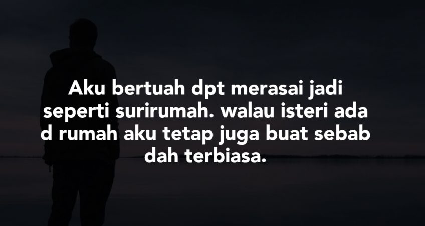 Org rumah pula yang g kerja cari pendapatan.. duit2 belanja anak2, bil2 semua atas urusan isteri aku.. duit yang aku ada hanya utk pembelian barang dapur dan stanby utk beli mknn andai lauk mentah dah licin dlm peti.. terpaksa juga beli mknn siap masak time anak2 balik sekolah pagi sebab mereka kena g sekolah agama pula petangnya..