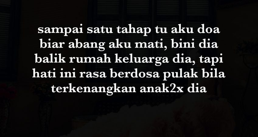 lepas tu kalau kena tegur macam2 lah post kat socmed.. nanti keluarga dan kawan dia backup macam sadis betul hidup dia.. aku tak kisah lah kalau dia nak tunjuk dekat orang lain tapi janganlah dekat mak bapak aku yang terima dia dulu… mak bapak aku masih layan dia baik… dia duduk serumah dengan mak bapak aku dan adik aku, adik aku dia pjj dengan laki dia sementara dia dapat posting tempat laki dia.. adik aku dia selalu mengadu, aku ni kalau tak nampak dengan mata kepala malas aku nak amik tahu.. tapi bila aku selalu sangat nampak siapa boleh sabar, aku pernah gaduh dengan abang aku, sampai satu tahap bapak aku nak halau dia dengan bini dia tu, tapi sebab kenangkan mak aku tu banyak penyakit takut pulak jadi pape.. jadi ikutlah cakap mak aku suruh bagi peluang…