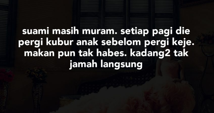 Anak kami meningga* dalam kemalangan tu. suami saya dihantui perasaan bersalah sangat2 sebab die rase die yang punca kemalangan sampai hilang nyawa anak kami. sekarang ni suami masih muram. setiap pagi die pergi kubur anak sebelom pergi keje. makan pun tak habes. kadang2 tak jamah langsung. saya dah puas pujuk die. nasihat. Itu bukan kehendak kite. sudah takdir allah. walaupn berat ujian ni kite kena teruskn hidup. saya harap ade kawan2 yang bole bagu taw care nak pulihkn semangat suami saya ni. terima kasih
