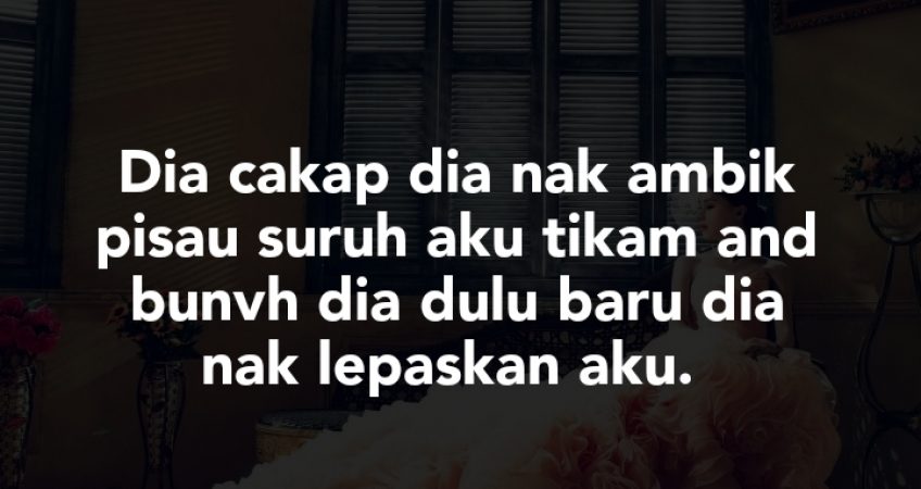 nak dijadikan cerita, minggu ni dia ajak balik kampung belah suami. aku dah cakap, aku xnak ikut kalau boleh. ntah, mungkin dah rasa tak sedap hati. macam2 tahu2 apa nak jadi. Dalam kereta, kitorang berselisih pendapat lagi so aku merajuk taknak cakap dengan dia. sampai je rumah mertua, solat sekali ngan dia aku terus dok dalam bilik. so, berbalah mulut dalam bilik dan kadang2 dia tinggi suara. aku tak tahan aku cakap lepaskan jelah aku. dia cakap dia nak ambik pisau suruh aku tik*m and bun*h dia dulu baru dia nak lepaskan aku. so,dia keluar ambik pisau di dapur dan masa tu mak ngan ayah mertua aku nampak dan tahan dia. So,keluarlah cerita kat parents dia yang aku treat dia macam sampah dan dia rasa nak gila disebabkan aku.