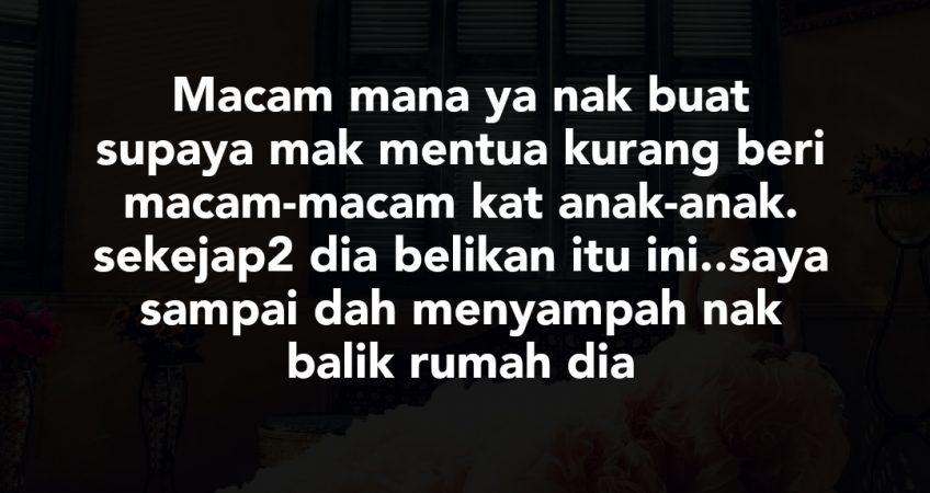 So far takda masalah sangat dengan suami..tapi ada masalah dengan mak mentua.. Mak mentua baik. suka bagi macam-macam. tapi masalah nya dia suka mengungkit. saya bukan jenis suka meminta. Macam mana ya nak buat supaya mak mentua kurang beri macam-macam kat anak-anak. sekejap2 dia belikan itu ini..saya sampai dah menyampah nak balik rumah dia..dulu saya tak macam ni. saya suka anak2 rapat dengan atok wan dia. mak mentua n pak mentua. tapi setiap kali balik ada je mak mentua x puas hati dengan saya..