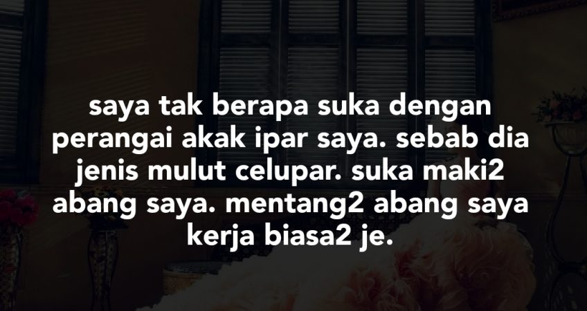 Assalamualaikum. Admin. tolong hide fb saya ye. tq. Saja nak luahkan,sbb terlalu kesian pada mak saya. saya ada seorang abang dan sudah berumahtangga.dlm 4 tahun lepas. abang saya dan isteri tinggal dengan mak dan adik beradik saya yang lain. saya cuma nak luahkan, saya tak berapa suka dengan perangai akak ipar saya. sebab dia jenis mulut celupar. suka mak*2 abang saya. mentang2 abang saya kerja biasa2 je. akak ipar pn bekerja, tapi biasa2 je lah. dia kata macam tu mungkin sebab dia bekerja. Anak da 2 orang. anak, kebanyakan urusan abang saya yang uruskan. isteri dia sibuk kerja, jadi abang saya je yang ada masa untuk jaga anak.