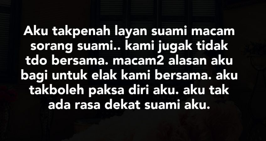 aku dah berkawen hampir dua tahun. famili aku dan famili mertua , orang utara. aku bekerja di selatan. dan suami bekerja di utara. hampir dua tahun kawen, aku takpenah layan suami macam sorang suami.. kami jugak tidak tdo bersama. macam2 alasan aku bg utk elak kami bersama. aku takboleh paksa diri aku. aku takda rasa dekat suami aku. since sblom akad nikah, mmg aku taknak kawen, tapi mak aku ckp smua jmputan dah pgl. malu kluarga. jd aku korbnakan diri aku utk semua orang. aku beranggapan aku boleh cuba cari rasa kasih sayang balik .. tapi dua tahun ni, nothing.. aku semakin serabut.