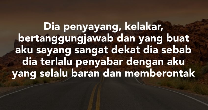 Mungkin pebezaan umur 9 tahun buat dia lebih matang berbanding aku. Aku tersangat bahagia dengan dia. Dia penyayang, kelakar, bertanggungjawab dan yang buat aku sayang sangat dekat dia sebab dia terlalu penyabar dengan aku yang selalu baran dan memberontak. Dia tidak pernah tinggikan suara walau sekali dan macam mana degil pun aku. Ya, aku suka cabar kelakiannya. Dia juga terlalu memanjakan aku, tidak pernah berkata ‘tidak’ tentang apa sahaja yang aku inginkan.