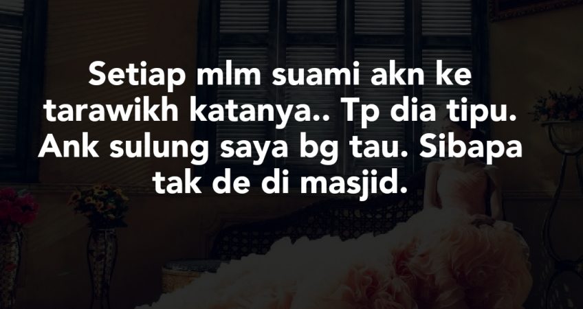 Ramadhan tahun tu.. Saya tengah sarat hamil.. Setiap mlm suami akn ke tarawikh katanya.. Tp dia tipu.. Ank sulung saya bg tau.. Sibapa tak de di masjid. Ada satu hari tu lansung tak balik.. Konon nya qiamulail.. Lagi sedih kerap buka puasa diluar..tinggal lah saya dgn ank2.. Sikap suami berubah sangat..