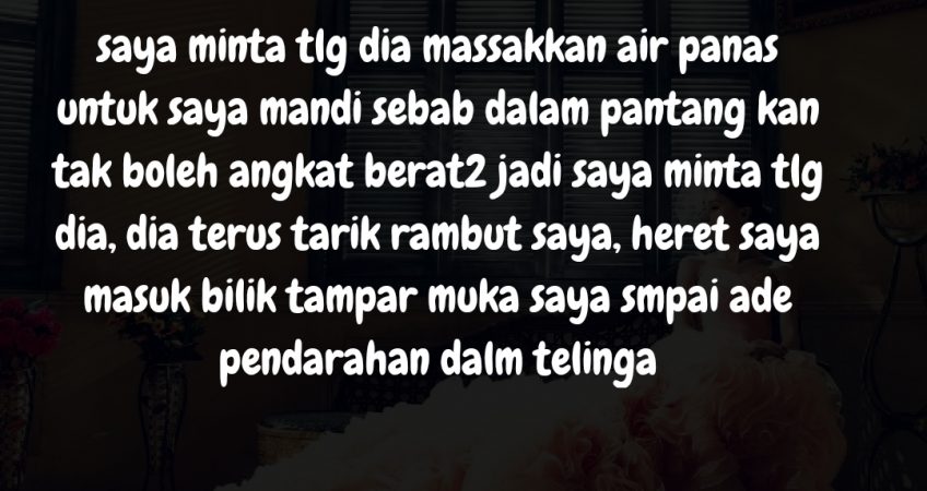 ade 1 masa dia nak tgok anak masa tu lah dia menangis depan saya kata nak beruah semua, saya pun balik dengan dia semula..tapi tulah hnya beberapa hari saja dia buat balik pngai yang sama tapi kalini kat tmpat kje pula, dia kata nak ot naluri saya kuat mngatakan yang dia tak ot jadi saya kol kawan opis dia saya tnya, kawan dia kata harini tak ade ot, saya wassap dia soh balik juga ,kalau tak balik saya sendri akan pergi ke tempat kerja dia, dia pun balik, sampai je dirumah saya minta tlg dia massakkan air panas untuk saya mandi sebab dalam pantang kan tak boleh angkat berat2 jadi saya minta tlg dia, dia terus tarik rambut saya, heret saya masuk bilik tampar muka saya smpai ade pendar*han dalm telinga(sebulan gak pekak) masa tu tak pikey ape dah terus amek anak lari gi kedai maki saya, mak terus ajak buat report settle report dia mesej siap kata ak tak takot lgsong ko nak report bawak seberapa ramai polis tu ak hadap..