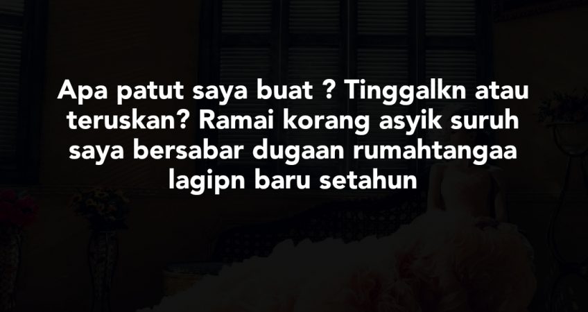 Untuk pengetahuan semua saya dengan die skrg ddk asing asing sebab dah kne halau dr rmh sewa… Kebetulan jumpa bilik sewa tuan bilik tu sewakan bilik yang mmg khas untuk prempuan sahaja… Die rse segan die g ddk bilik kwn die… Die balik bilik untuk makan mandi jer… Apa ptt saya buat ? Tinggalkn atau teruskan? Rmai korang asyik sruh saya bersabar dugaan rmhtgaa lagipn bru setahun… Mana tahu die berubh nnti, tapi smpai bile? Bila saya tegur die plakk die melenting sdgkn saya tegur benda baik . Slhkh skorang istri membebel? Hbis nak dngr kata siapa lagi ?