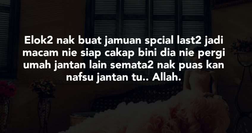 Elok2 nak buat jamuan spcial last2 jadi macam nie siap cakap bini dia nie pergi umah jantan lain semata2 nak puas kan nafsu jantan tu.. Allah.. Perit sangat rasa nya.. Last daripada bebalah tadi sampai lah nie tak bercakap tak tegur sape pun.. Penat lah min nak layan orang macam nie.. Dia ingat bini dia nie ape.. Subahanallah.