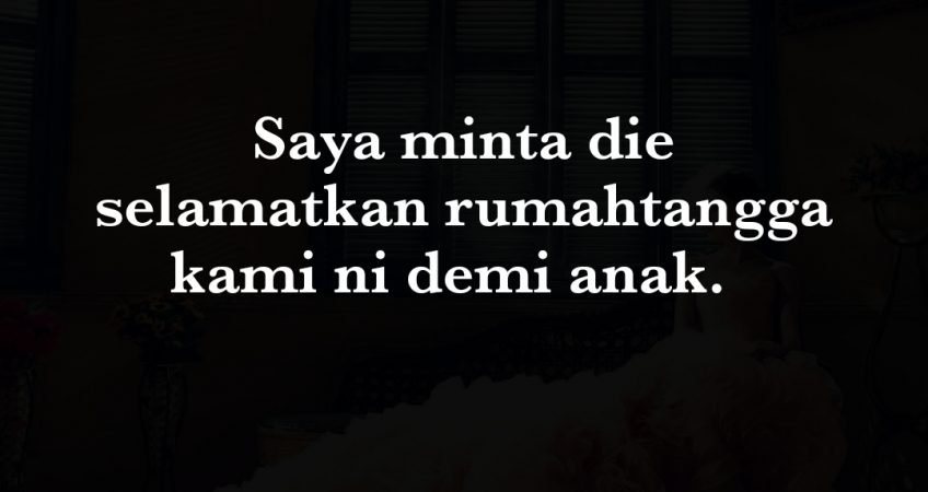 “Tengok! Memang awak dah tak kan boleh terima saya. ” Dan kata saya halus. Saya terima die. Saya minta die selamatkan rumahtangga ni demi anak. Die memilih saya dari wanita Tu. Die janji takkan hubungi wanita Tu.