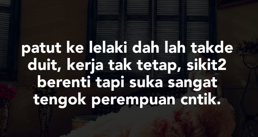 Hi warga KRT .. saya cuma nak minta pendapat dan nasihat je. cerita ni mngenai saya sebagai seorang isteri. saya nak tanya patut ke lelaki dah lah takde duit, kerja tak tetap,sikit2 berenti tapi suka sangat tgok pmpn cntik. saya dah perasan dah sebenarnya lelaki jenis ni macam mana tetapi saya masih tidak percaya lagi kenapa suami buat saya macam ni.
