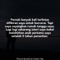 Aku dapat tahu semua dari pengakuan kekasihnya. Separuh jiwa aku pergi.Dengan keadaan aku yang hamil. Ikut hati aku matti, tapi aku kuatkan hati dan akal dengan memaafkan suami dan menjaganya selamanya dia sakit dan terlantar. Suami aku tidak putus putus mohon maaf setiap hari dari aku.Tidak aku pinta jasaku dibalas.Dan tidak kupinta wang perbelanjaan kos pembedahan hampir 10k dibayar balik. Biar Tuhan sahaja yang menilainya. Atas rasa tanggungjawab aku sebagai isteri,dan ibu kepada anak anakmu aku berdiri teguh disini. Ya memaafkan itu mudah. Melupakan itu tidak bagi aku.Setiap hari airmata ini pasti akan jatuh.