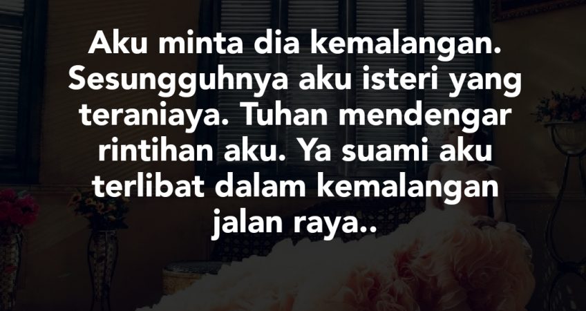 Kadangkala waktu suami aku keluar aku seakan tidak sedap hati. Aku tetap rasakan ada sesuatu. Aku berdoa kepada Tuhan jika suami aku melakukan sesuatu yang buruk di belakang aku, aku minta Tuhan tunjuk kebenarannya. Aku minta dia kemalngan. Sesungguhnya aku isteri yang teraniaya. Tuhan mendengar rintihan aku. Ya suami aku terlibat dalam kemalngan jalan raya bersama kekasihnya. Waktu aku dapat tahu mengenai kemlangan tersebut sumpah aku tidak langsung terkejut. Seakan aku dapat membacanya dari awal. Keadaan suami aku dan kekasihnya agak parah. 3 minggu suami aku di hospital.Aku sedih diperlaku begini demi Tuhan aku maafkan mereka. Aku tidak salahkan kekasih suami aku kerana dia tidak tahu yang suami aku sudah berkahwin.