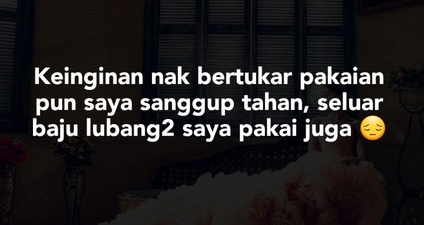 Saya tak ade tempat luahan. Nak diceritakan pada kawsn riso aib suami, nak ceritakan pada fmily salah sorang yang terdekat pun risau nanti dorang benci die.. Disini saya harap dapst saya luahkan apa terbuku di hati.. Disini tiada siape pun thu saya. Keinginan nak bertukar pakaian pun saya sanggup tahan, seluar baju lubang2 saya pakai juga. Nak tkar pakaian die cakap kene tunggu sampai die dah pulang nanti. Shopping puas2 katanye.