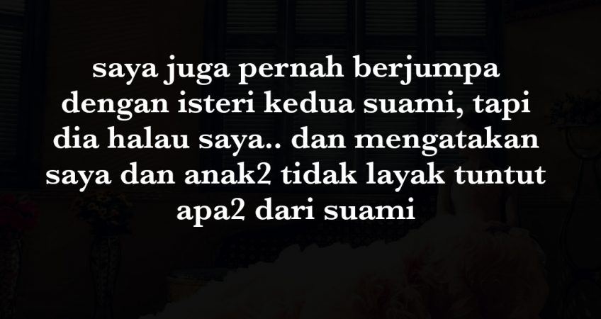 Bila saya tanyakan suami kenapa buat saya dan anak2 macam ni, suami cakap dia takut isteri keduanya akan buat apa2 pada kami. akan saman dia. dan rasanya sekarang ni, suami diamkan diri kerana perkara ini. suami jadi seperti seorang yang saya tak kenal.. saya penat.. hari2 saya ditekan oleh family saya.. kenapa kes tak selesai lagi. kenapa saya masih menunggu suami. saya tak minta keadaan jadi macam ni. Sekarang ni masalah bertambah bila saya mengandung dengan suami entah kemana sekejap muncul sekejap hilang saya buntu adakah patut saya libatkan keluarga suami dan keluarga isteri kedua suami? saya cuma nak masalah ni selesai.