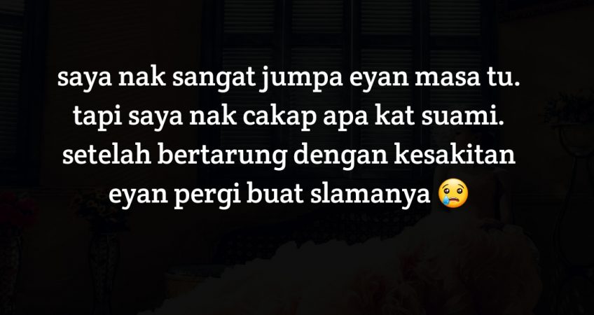 saya abaikan je mimpi tu. kalau saya luahkan pun buat apa. saya dah ada life saya sendiri. pagi tu kawan wasap saya, bagitau yang Eyan dah tunggu masa je..semua kawan2 sekolah dulu semua ada tengok eyan masa tu. Tiba2 saya jadi sedih. saya nak sangat jumpa eyan masa tu. tapi saya nak cakap apa kat suami..