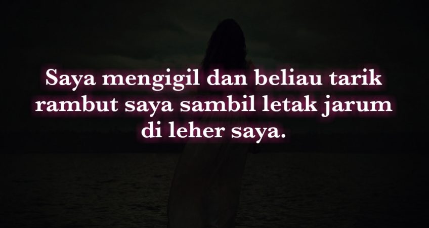 Selesai kerja kami ada hi tea saya duduk semeja dengan beliau tanpa saya sedari, saya ceritakan hal cerai saya kepada beliau. Beliau beri saya nasihat berpandukan agama dan beliau mengajak saya masuk ke bilik beliau mahu tunjukkan vedio ceramah agama. Saya dan kawan perempuan saya masuk tanpa bersangka buruk. Semasa dalam bilik beliau. Kawan saya minta izin keluar ambil makanan. Selepas itu, lelaki tersebut memeluk saya dari belakang dan cakap, “Kalau jerit saya tuduh awak goda saya”. Saya mengigil dan beliau tarik rambut saya sambil letak jarum di leher saya.