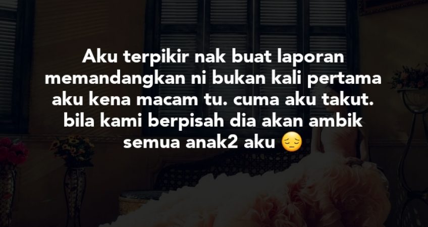Assalamualaikum min. first time mengadu kat sini. sebab aku dah tak tau nak luah pada siapa. nak post di fb takut mengaibkan sebab orang tau aku sape. nak cerita pada seseorang aku tak nak. tak nak menyusahkan dan mengaibkan suami aku. Semalam aku kena pijak kat muka dan kena pukul dikepala berkali2 disepak dibelakang dan dipinggul berkali-kali. Puncanya sebab dia marah ada kawan lelaki zaman sekolah komen kat post fb aku. Aku pun tak tau tu salah atau tak. bangun pagi ni semua dah sakit2. aku terpikir nak buat laporan memandangkan ni bukan kali pertama aku kena macam tu. cuma aku tkt. bila kami berpisah dia akan ambik semua anak2 aku. oh ya. aku ada 3 anak.