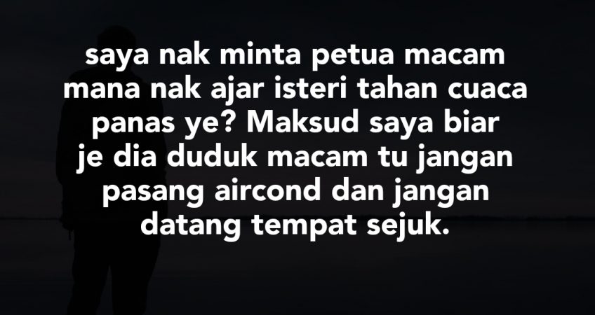 Pelik aku dengn perangai dia.. kalau hujan turun bulan 6 nanti kat malaysia bini aku akan jadi sejuk jadi aku akan pindah ke tempat panas pulak kat australia. Demi masa depan biarlah berpanas bersejuk dahulu bersenang di kemudian hari…. saya nak minta petua macam mana nak ajar isteri tahan cuaca panas ye? Maksud saya biar je dia duduk macam tu jangan pasang aircond dan jangan datang tempat sejuk.