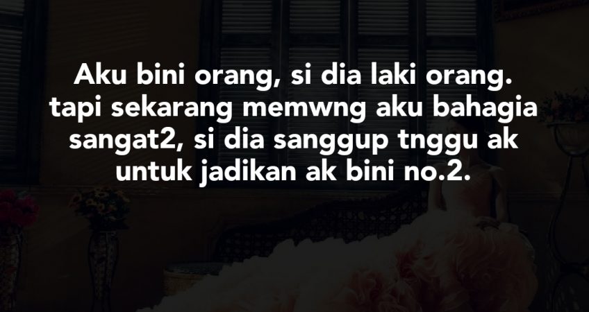 Tapi baru2 ni kami terserempak dan start dari situ aku dengan dia dah mula rapat sebab masing2 ada masalah dengan pasangan. aku ada masalah dengan suami aku, yang 24 jam asyik mengadap hp je. aku naik stress meyampah smua ada. Bukan dia layan pubg ke coc ke. dia dok godek2 tah ape2 la dalam fb tu. dh la ak susah nak jmpe dia, cuti payah, balik keja tengah2 malam. bila dapat jmpe sibuk dengan hp. aku jadi menyampah la, hati aku pun sakit sangat2. aku tak nak ape pon, aku nak kan perhatian je dari suami aku. berpuluh2 kali dah aku tegur, masih tak jalan. laki ak tetap buat balik perangai dia tu. .aku tau ape aku buat salah. Aku bini orang, si dia laki orang. tapi skrg mmg ak bahagia sangat2, si dia sanggup tnggu ak untuk jadikan ak bini no.2. ak slalu juga baca2 page ni selalunya laki orang ni banyak nak main2. aku risau macam tu..